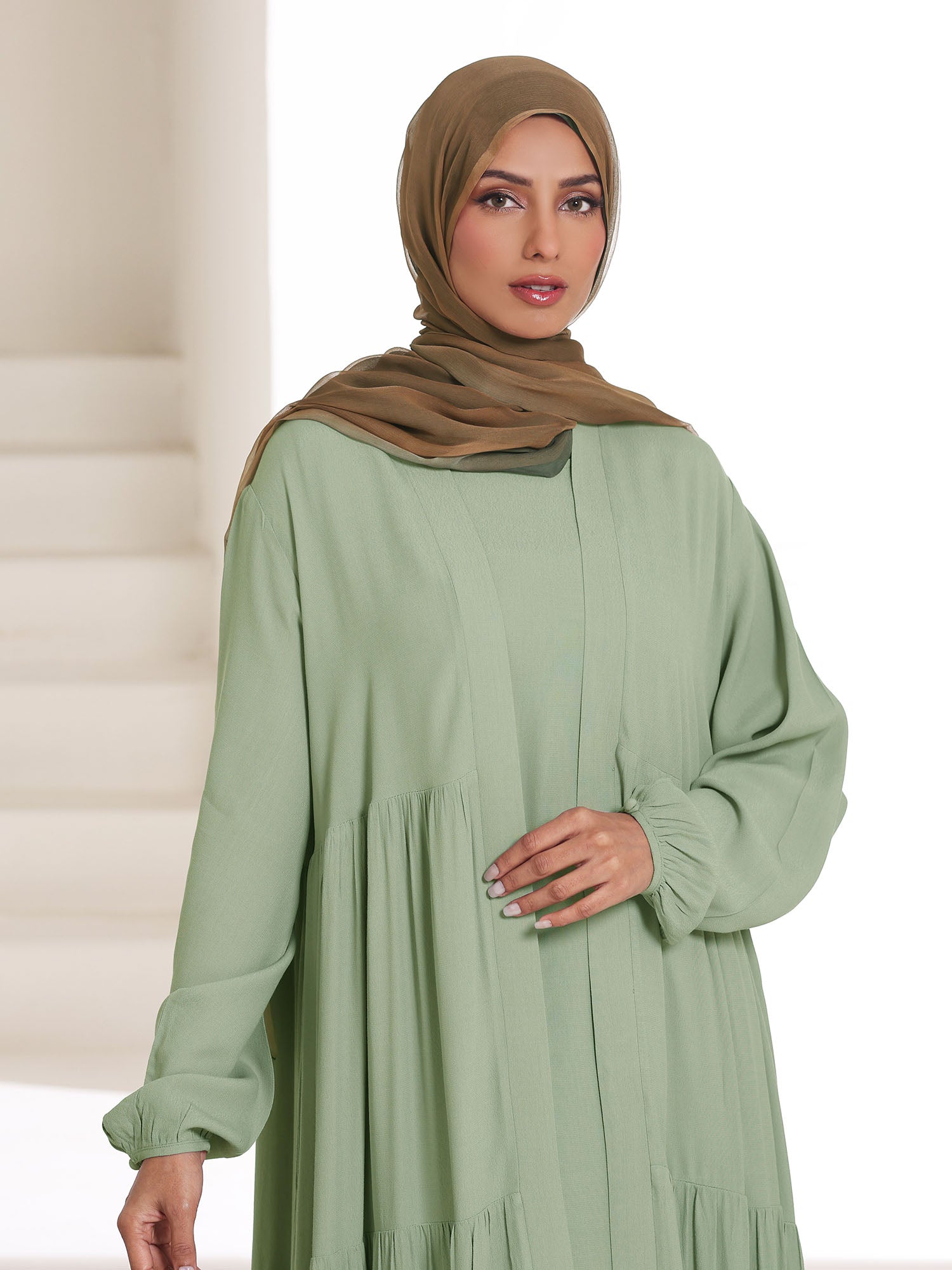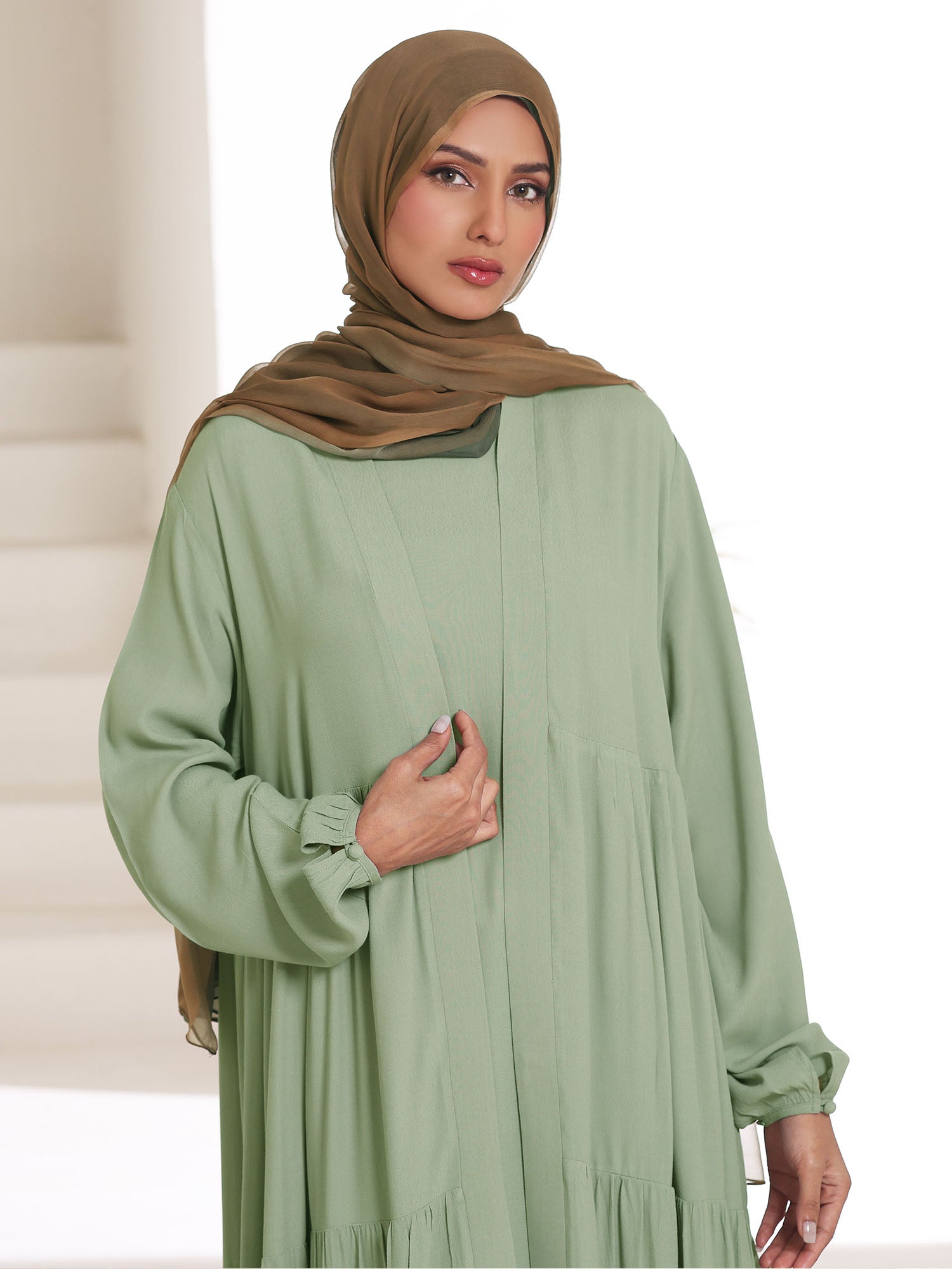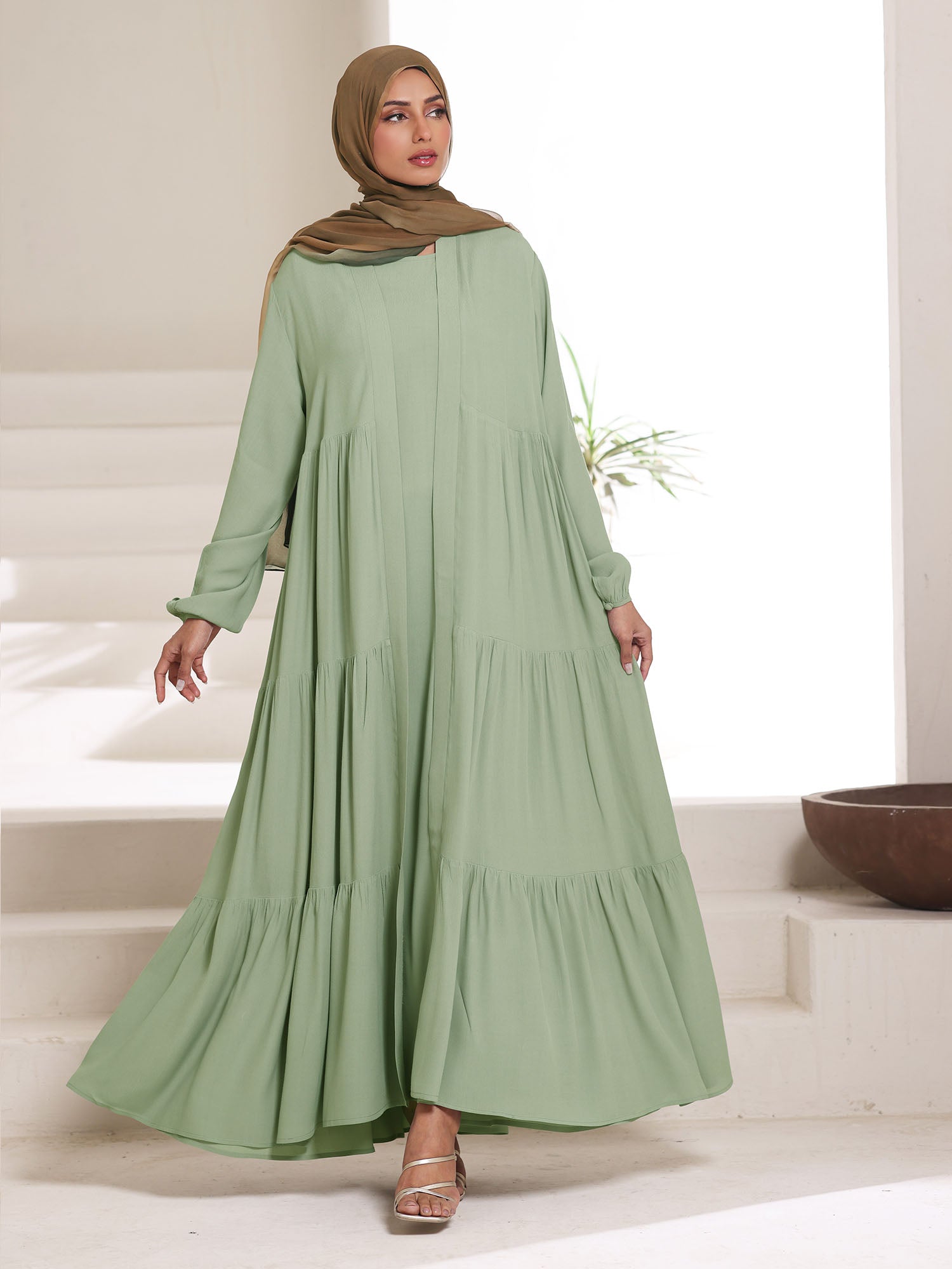 A sage green, front-open kimono designed in a flared A-line multi-tier silhouette for graceful movement.