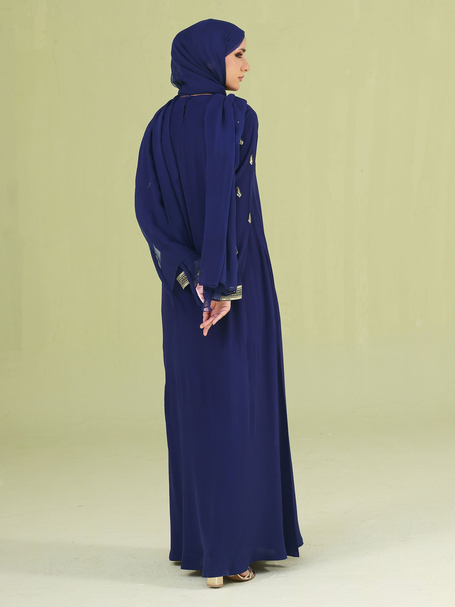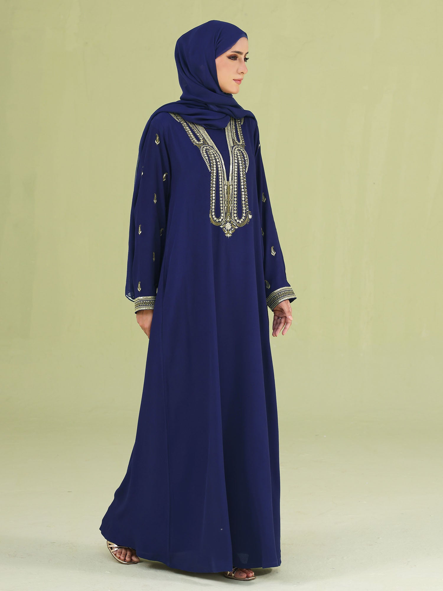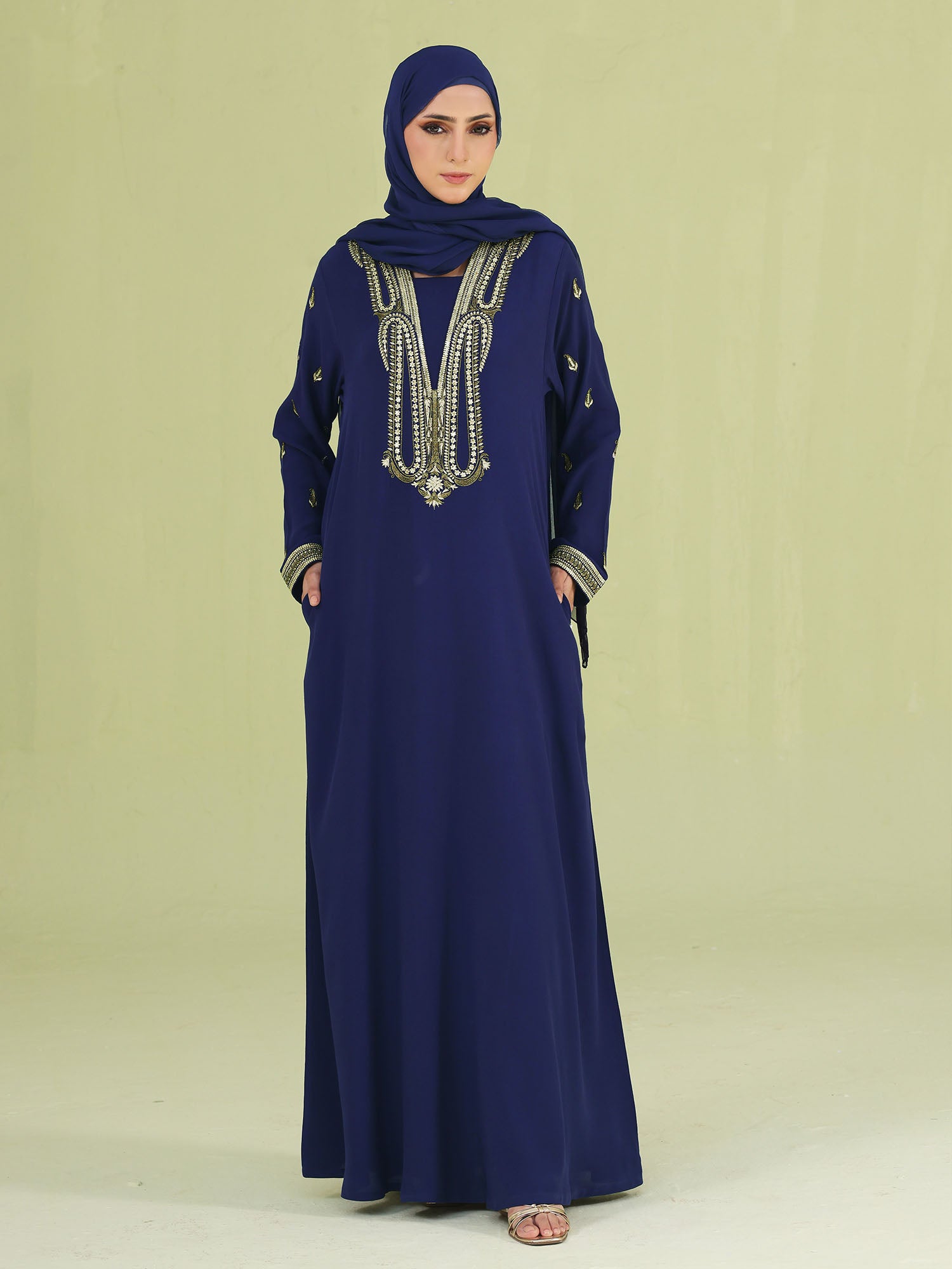 Designed for elegant occasions, this statement abaya is beautifully finished with gold sequins and gold zari embroidery on the front neckline and sleeves—bringing the perfect touch of festive shimmer to your look.