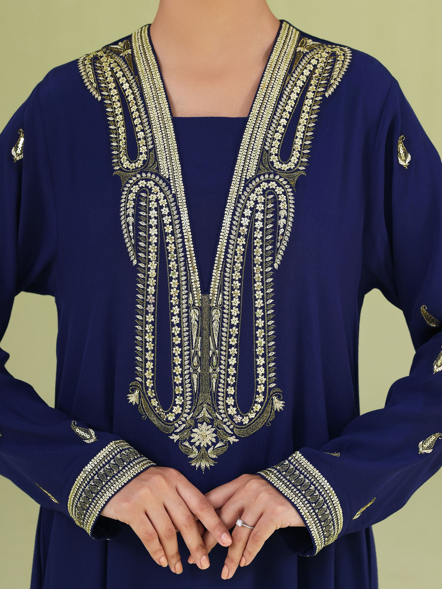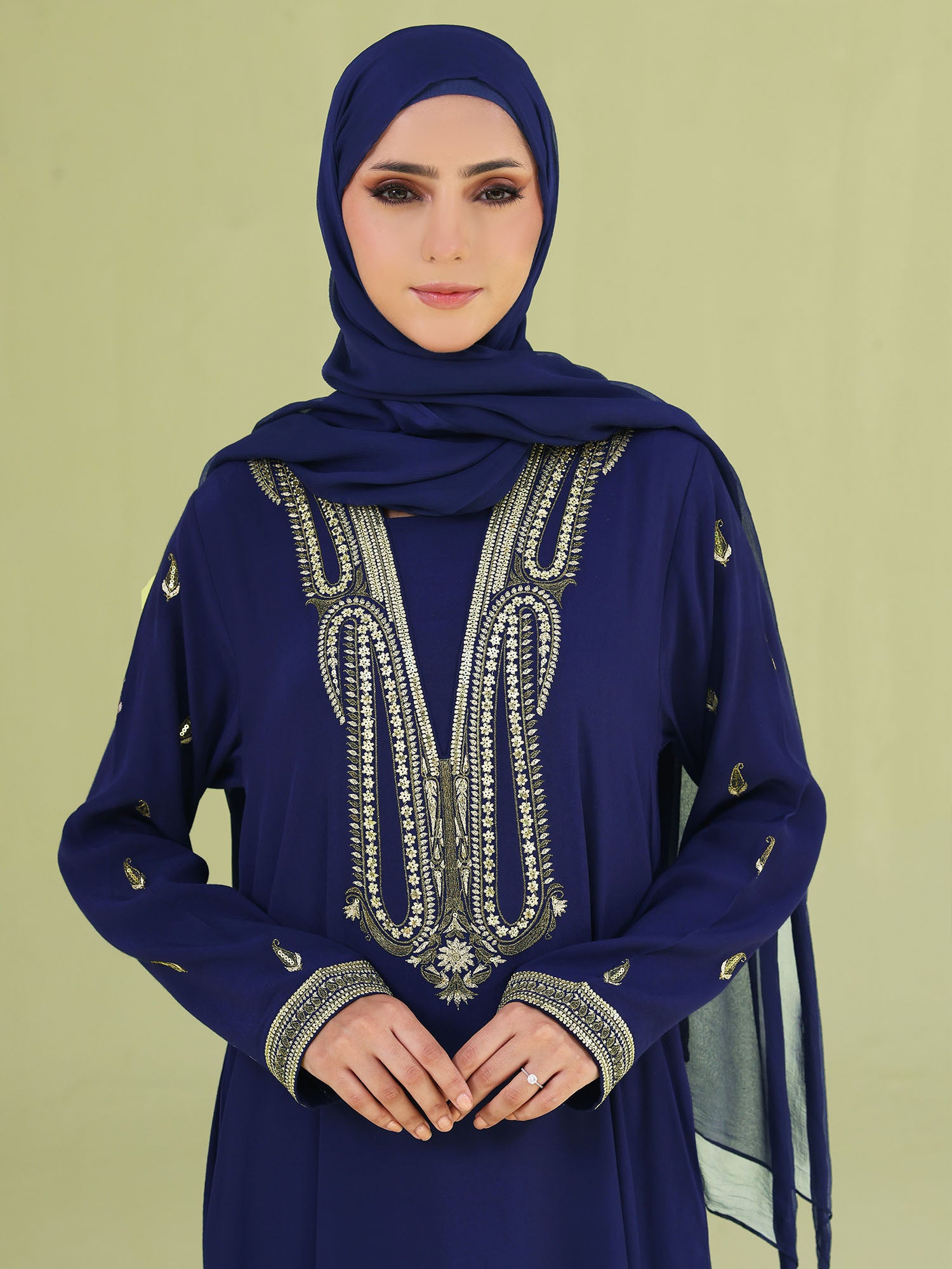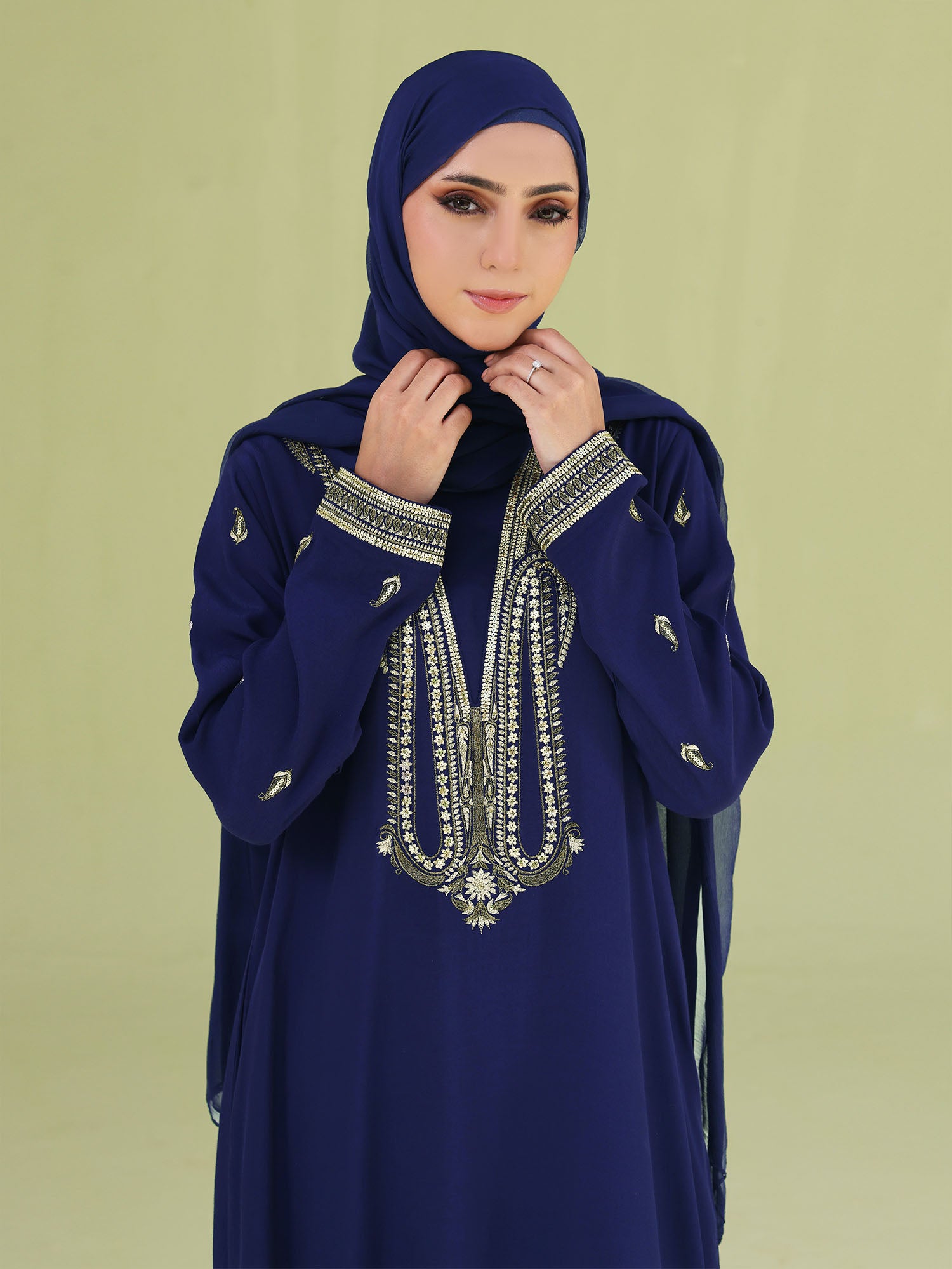 Designed for elegant occasions, this statement abaya is beautifully finished with gold sequins and gold zari embroidery on the front neckline and sleeves—bringing the perfect touch of festive shimmer to your look.